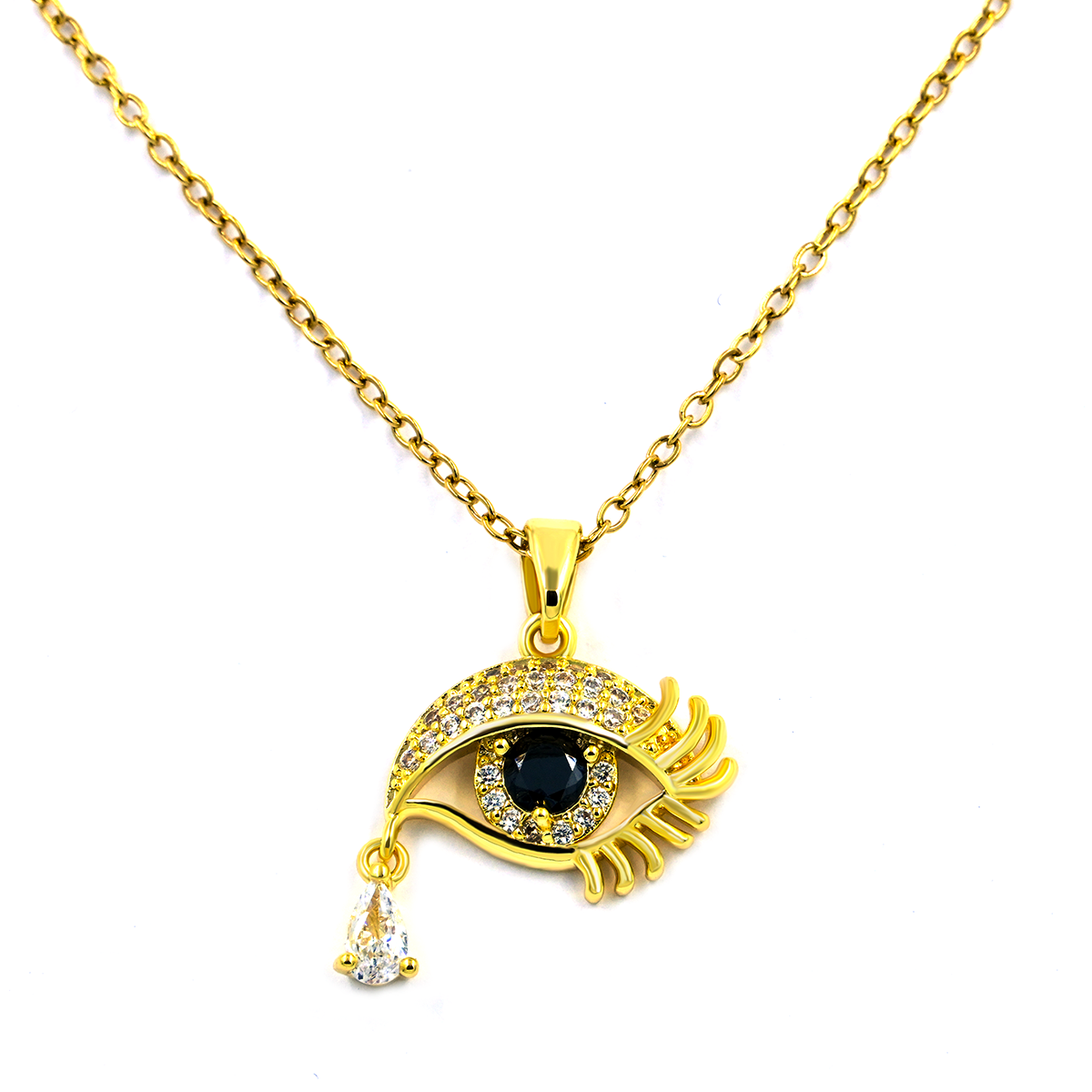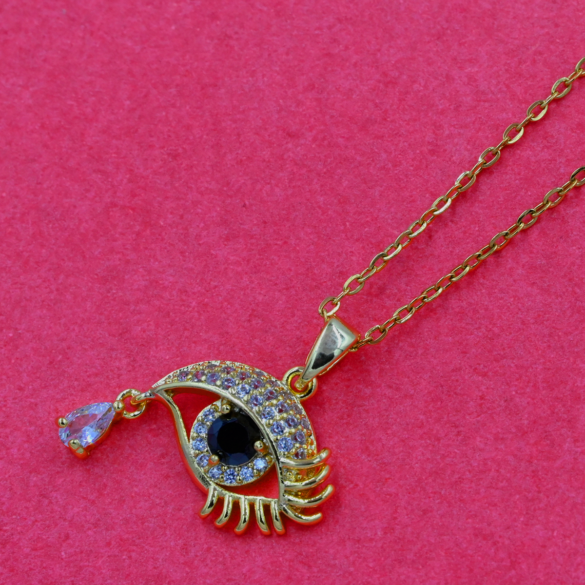 Keep away bad luck with this special pendant. It's called the Evil Eye pendants. It has a black stone in the middle, shaped like an eye. The edges are shiny gold. Wear it around your neck and feel protected. It's like having a lucky charm with you all the time.