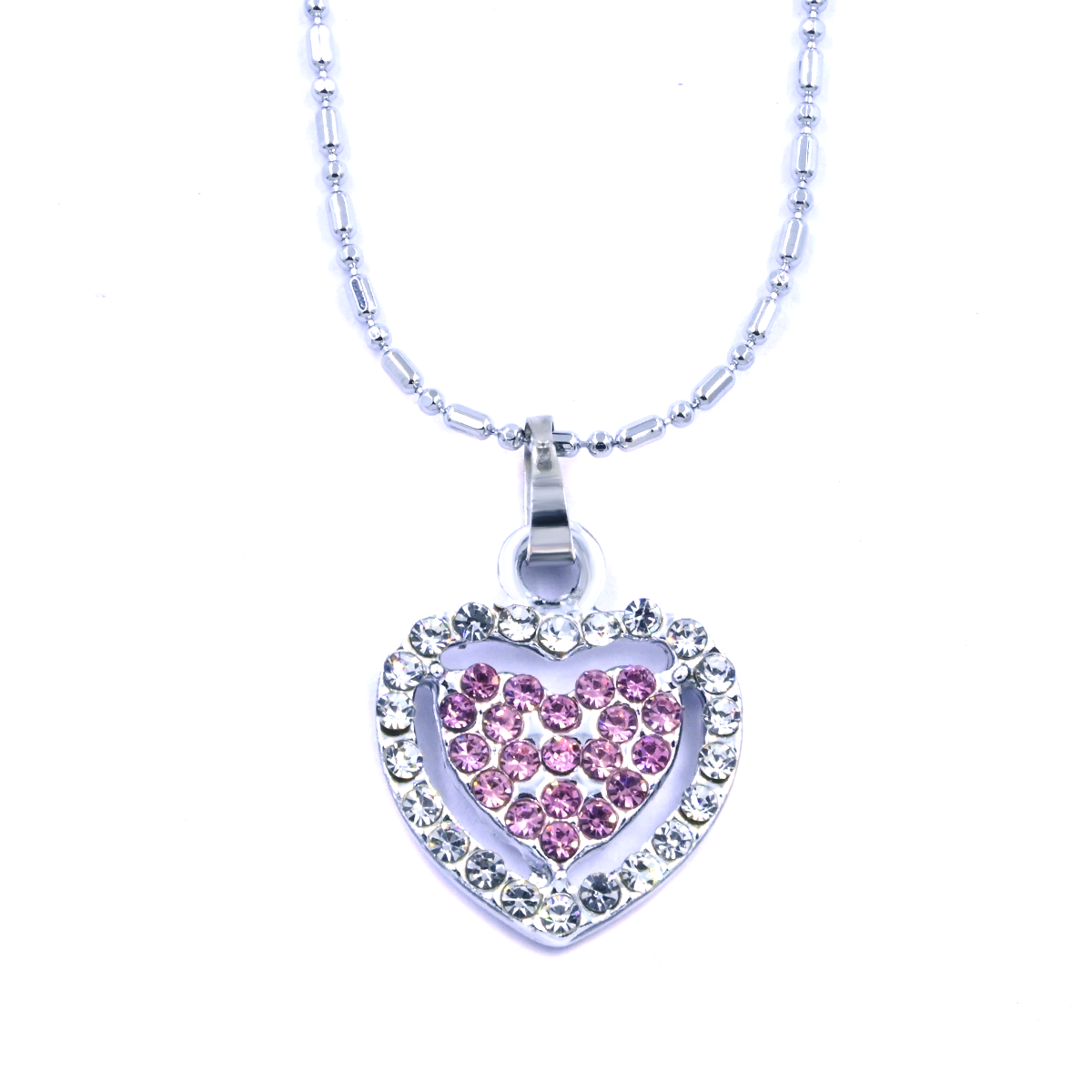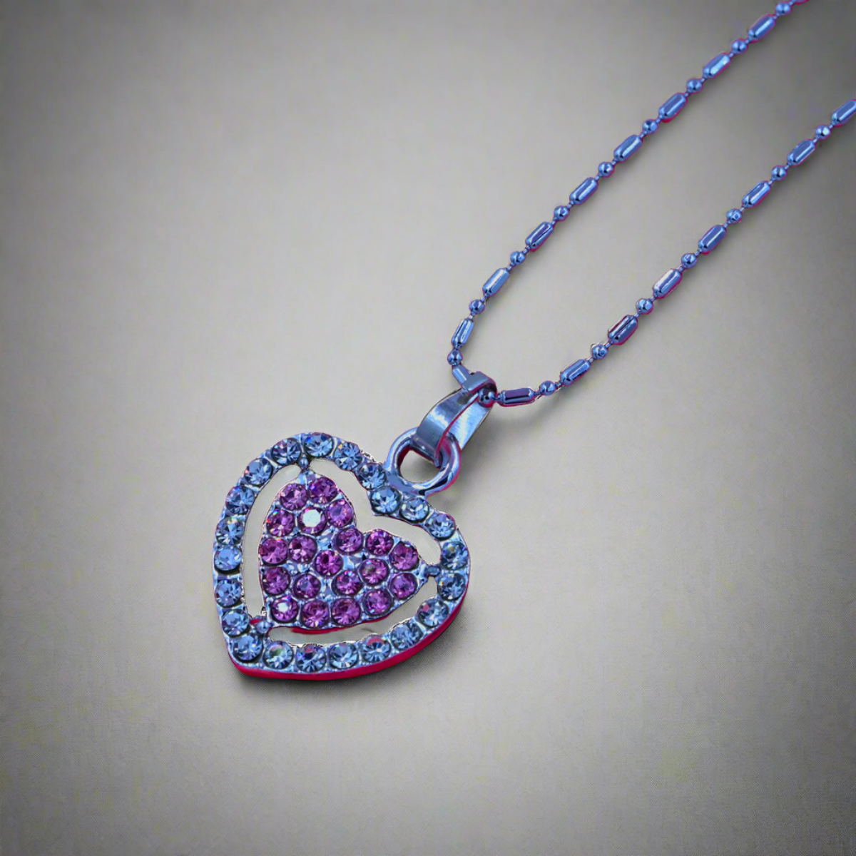 Get ready to dazzle with our Heart Duo pendant! This charming necklace features two hearts: a larger one made of shiny silver and a smaller one nestled inside. The smaller heart is adorned with beautiful pink gems, while the outer heart sparkles with stunning silver gems. It's the perfect accessory to add a touch of elegance to any outfit!