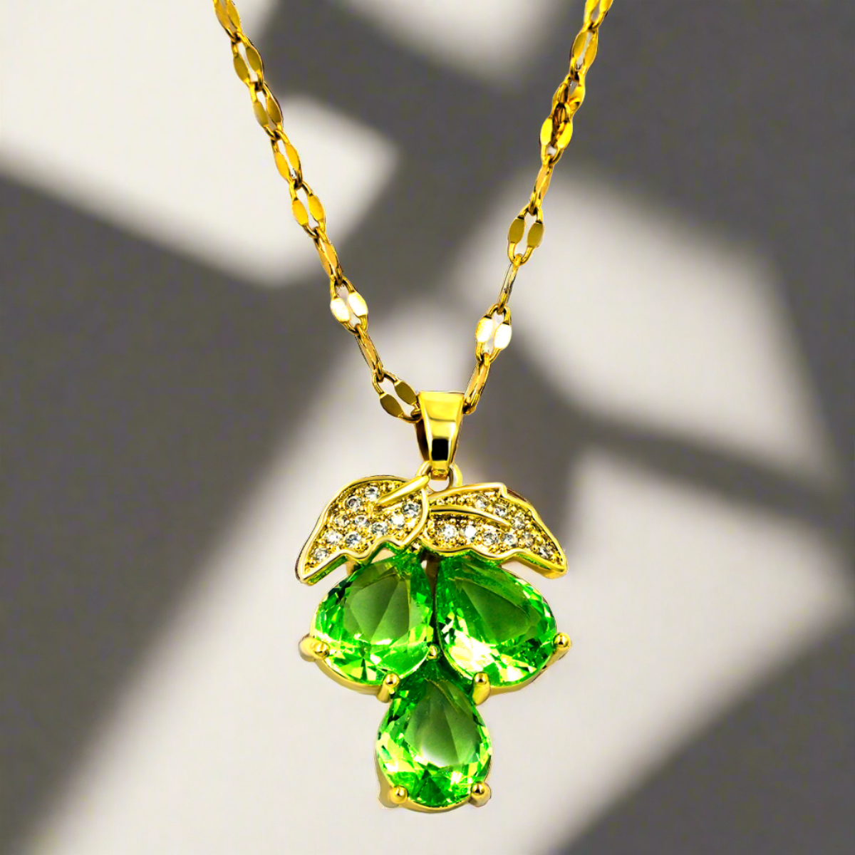 These pendants is decorated with small green things that look like diamonds but are in the shape of fruits, like grapes or apples. There are also little leaves made of gold around them. It's a lovely necklace that shines and sparkles.