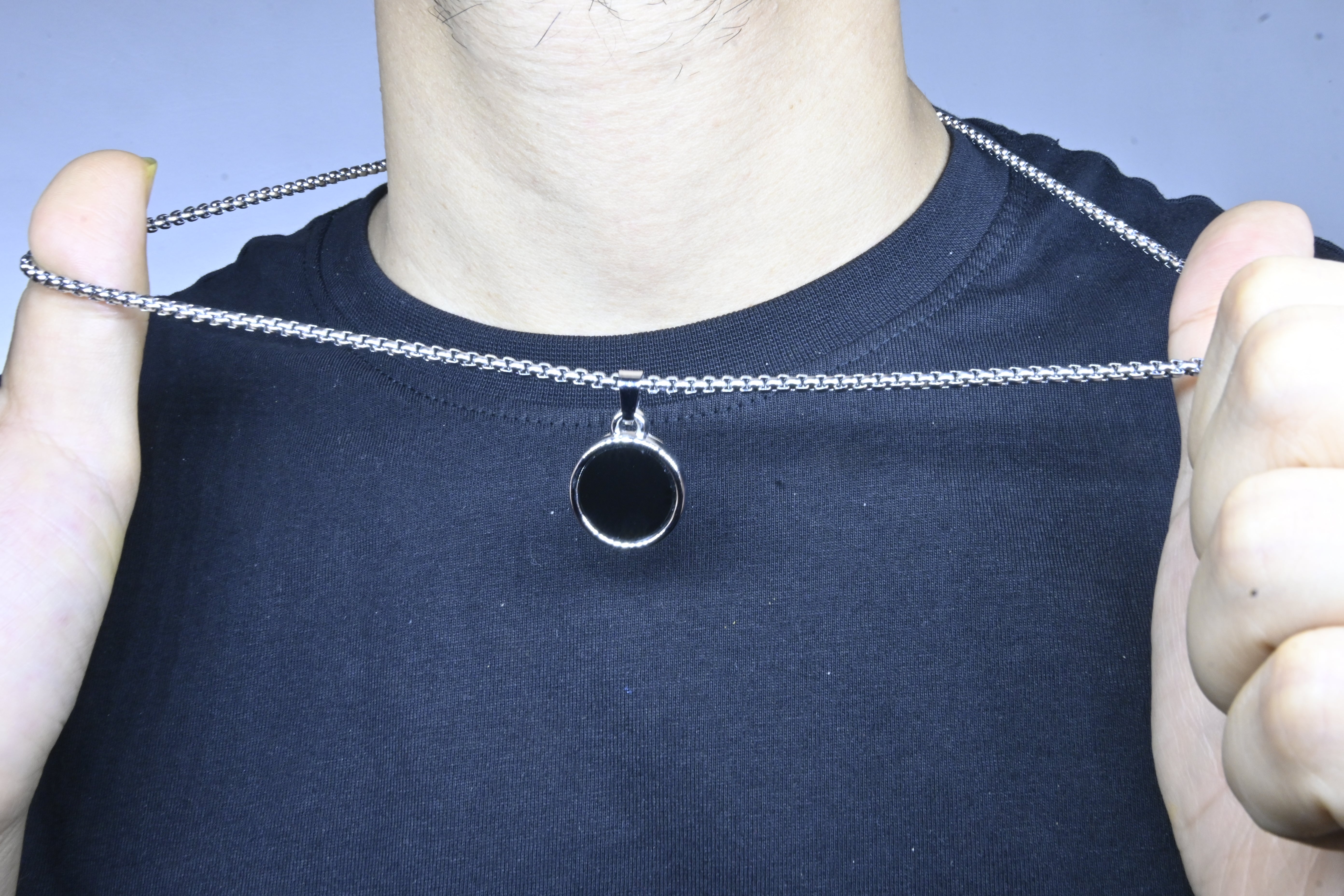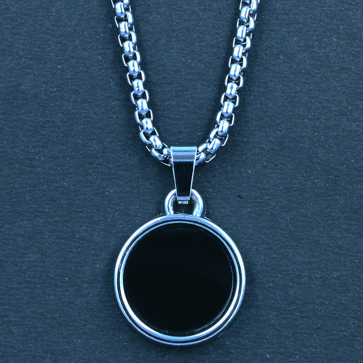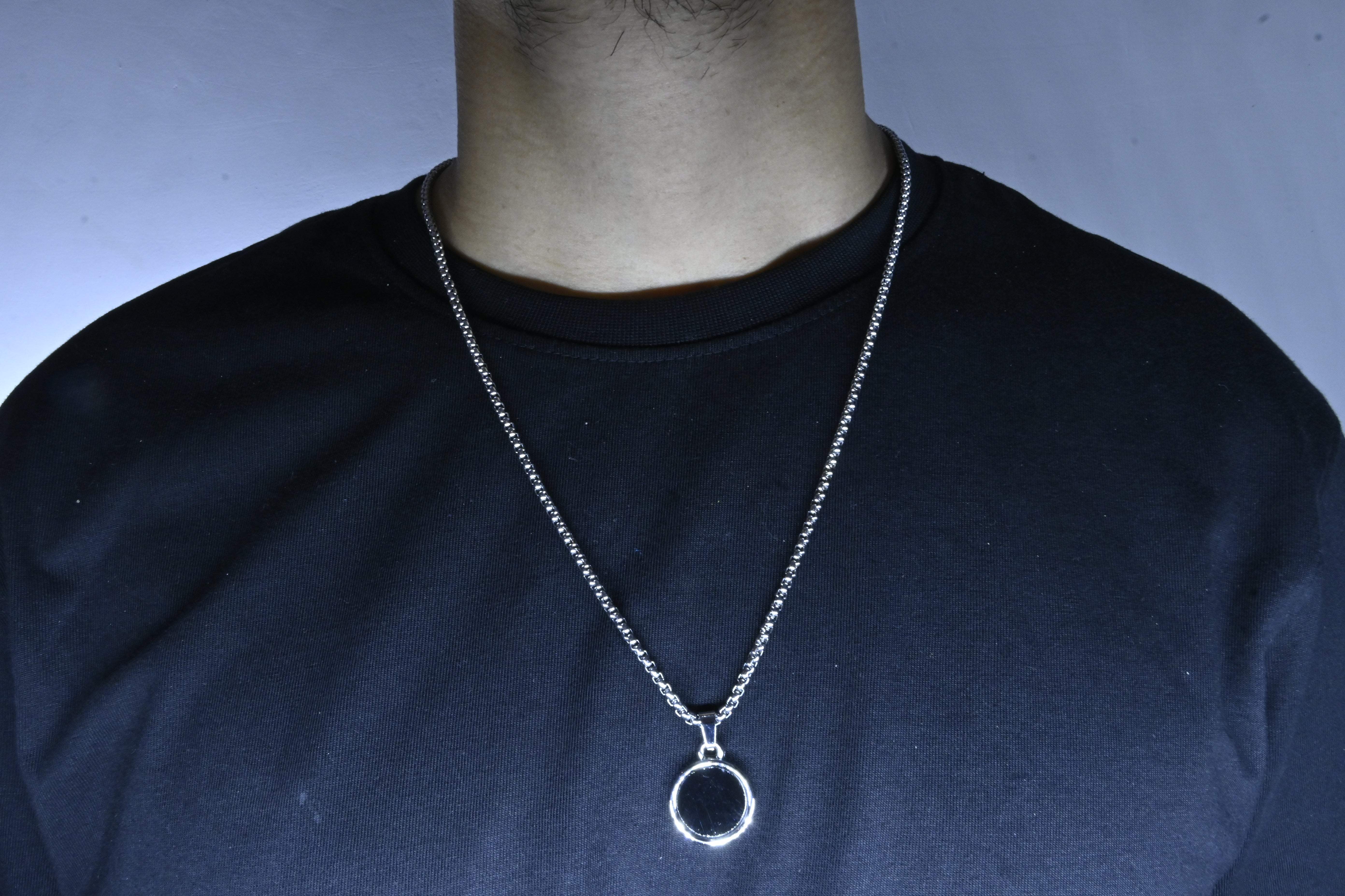 This pendant for men is stylish and refined, featuring a round shape with a shiny silver border around the edges. It's crafted to suit any occasion, adding a classy touch to any outfit. Whether you're dressing up or keeping it casual, this pendant brings a dash of sophistication to your look, making it a must-have accessory for guys today.