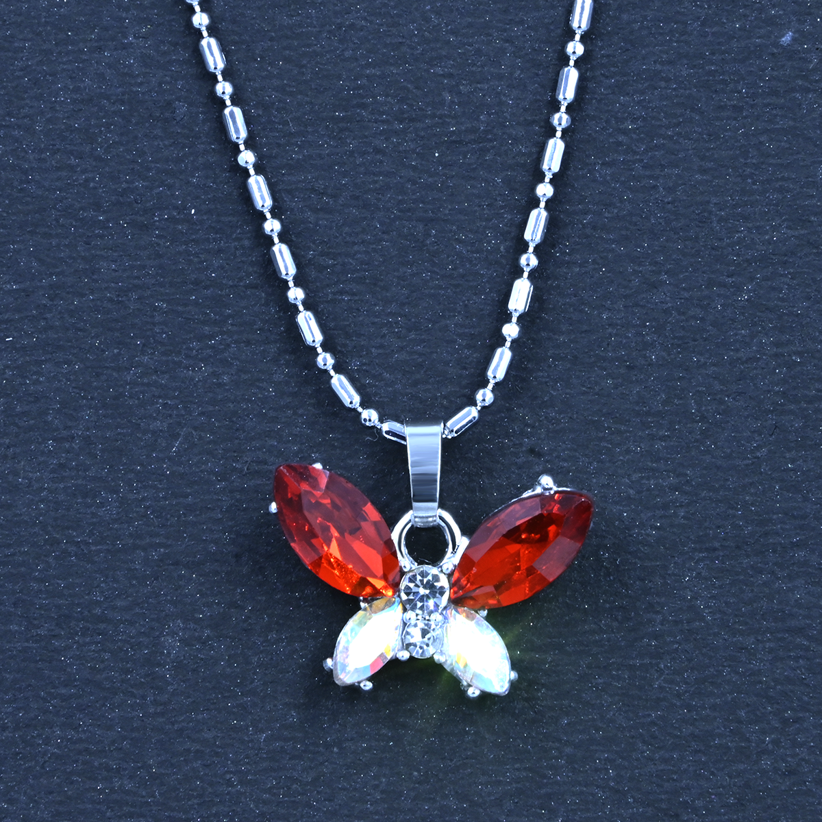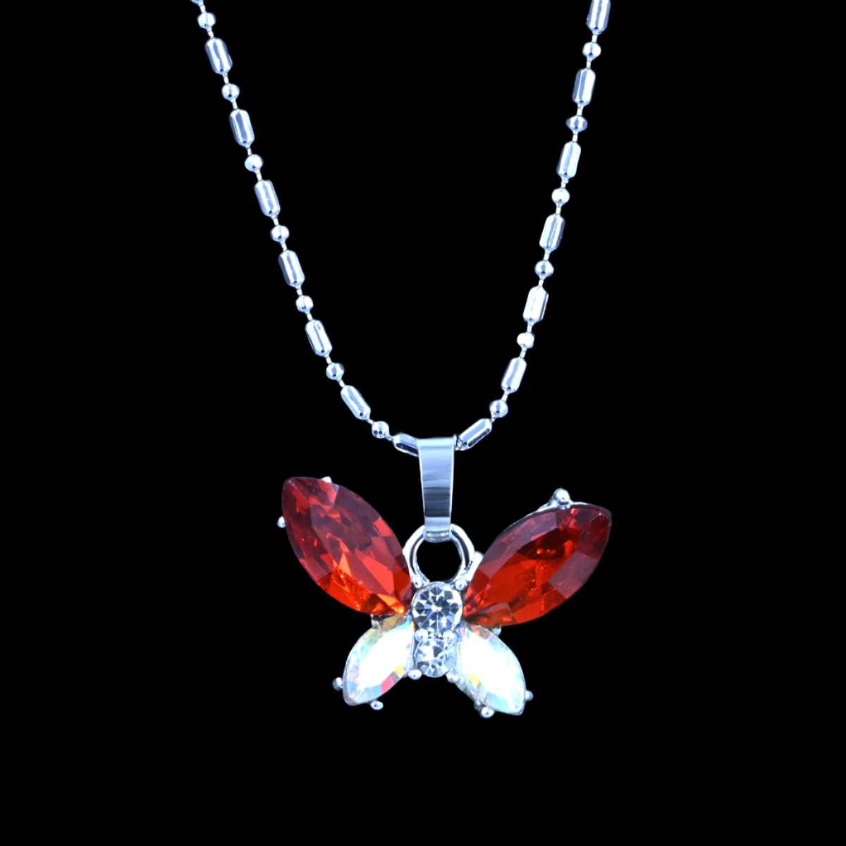 Necklace with a Red Gem Butterfly and Silver Chain Pendant. Bring a touch of nature-inspired elegance to your style with this lovely butterfly pendant necklace. The butterfly features a bright red gem that stands out beautifully. It hangs on a smooth and shiny silver chain, making it a wonderful accessory for any occasion. Whether you're dressing up for a special event or just adding some sparkle to your everyday look, this necklace is sure to be a favorite addition to your jewelry collection.